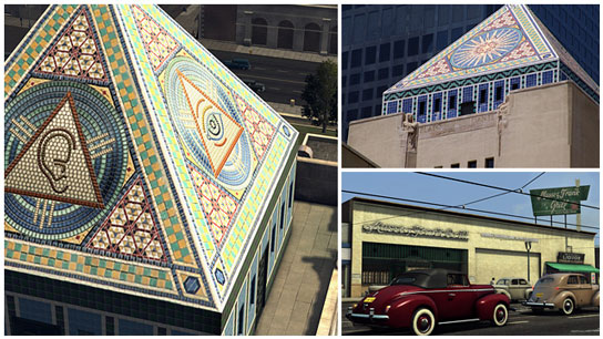 Left: The Egyptian-inspired tile mosaic rooftop of the Los Angeles Public Library as it appears in the game. Top Right: That rooftop as photographed by Team Bondi on their original research trip to Los Angeles during the game’s development. Bottom Right: L.A. Noire’s recreation of legendary Hollywood haunt, Musso & Frank Grill.
