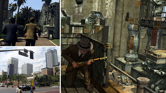 Top Left: Detectives Phelps and Galloway rush into downtown’s Pershing Square in L.A. Noire. Bottom Left: The real Pershing Square in L.A. today. Right: In a fun and intentionally anachronistic nod to a piece of Hollywood history, Phelps becomes engaged in a shootout on the crumbling set of D.W. Griffith’s “Intolerance”.