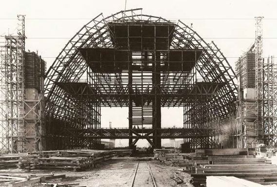 Because materials were in short supply during the war and steel was needed to produce ships and weapons, the hangars were constructed out of wood, a domestically produced, readily available resource. At the time of their construction, they were the world’s largest clear span wooden structures. They remain so today. Due to their unique design, mammoth size and fast construction schedule, the American Society of Civil Engineers named them one of the “Historic Civil Engineering Landmarks” of the 20th Century in 1993.