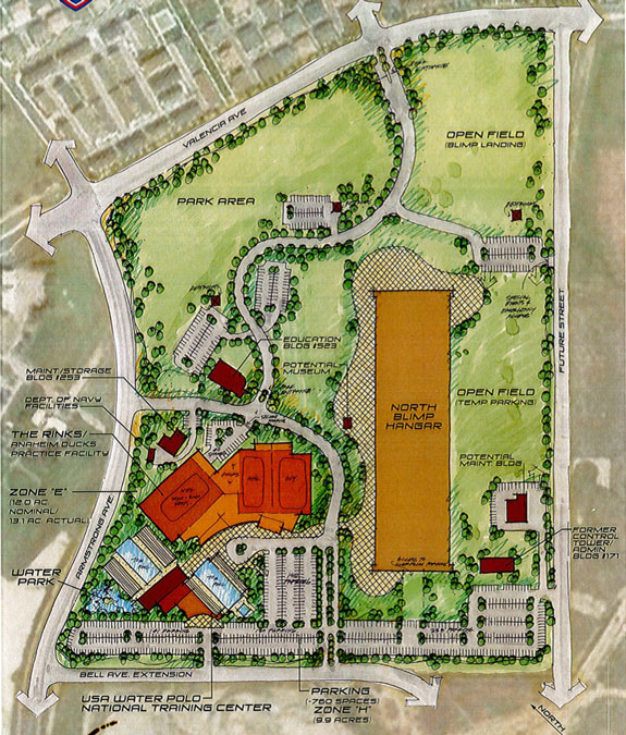 Last week the Orange County Parks Commission voted unanimously to approve a reuse plan for one of the landmark blimp hangars at the former Tustin Marine Corps Air Station. The approved concept plan involves restoring the north hangar and transforming the surrounding 84.5 acres into a regional park that will feature playing fields, tree lined trails, playgrounds and picnic areas. Future uses may also include water polo and ice hockey facilities. Due to its poor condition, the southern hangar is slated for demolition.