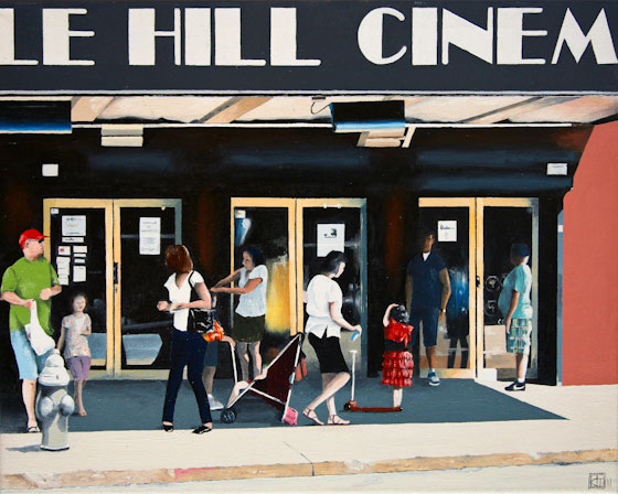 His painting “Cobble Hill Cinema,” which depicts the exterior of a Brooklyn Heights, NY theater, embodies the serendipity he embraces. “We were walking past the cinema and people were coming out with two or three children. What I didn’t realize when I took the photograph was there was a little girl there in the most amazing red frock with her arm over her head in a very unusual pose. And I still can’t work it out – why was she dressed like that? I love that idea. If you look at the painting she is clearly the focal point and yet that is by accident. I didn’t see her at the time.”