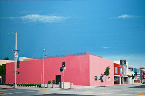 Tierney’s paintings are rendered in a highly realistic style. He uses oil paint to enhance the luminosity of each picture and his compositions are distinguished by their vibrant colors, the interplay of light and shadow, and the juxtaposition of form and space.  According to Tierney, his primary influences are Edward Hopper and David Hockney.