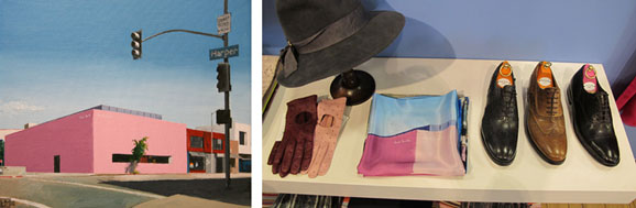 Painting of the Paul Smith store on Melrose Avenue by John Tierney and the Paul Smith scarf based on that image.