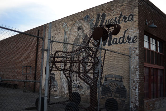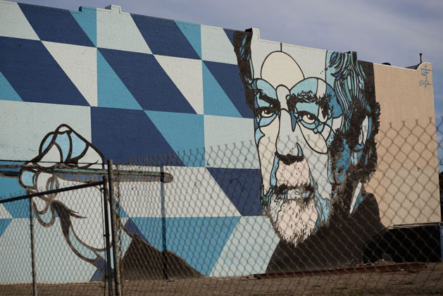 The work that is most prominent, however, is the work of today’s artists. A lot of it is commissioned or at least sanctioned by the city, and much of it rests behind chain-linked fences, giving it an interesting industrial quality. Most notably there is a tribute to the artist Karl Benjamin (1925-2012) by David Flores (1972- ). Benjamin was a local artist who was known for his mid-century non-representational work and also educated many of the community’s artists. The piece honors the tradition of Pomona’s artist community, which established itself in the area when manufacturing industries left.