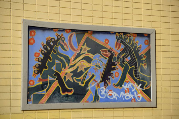 Gilbert “Magu” Lujan’s (1940-2011) Nuestra Madre serves as a kind of echo to Sheets’s Pomona. Both depict mythical women, but where Sheets was looking back to classical antiquity, Lujan was celebrating the Catholicism of the people who lived in Pomona during his time. With this piece and many others throughout Los Angeles, Lujan helped to establish the Chicano Movement as one of the most important artistic trends of his time. Untitled by David Rosales and others helps to continue that tradition.