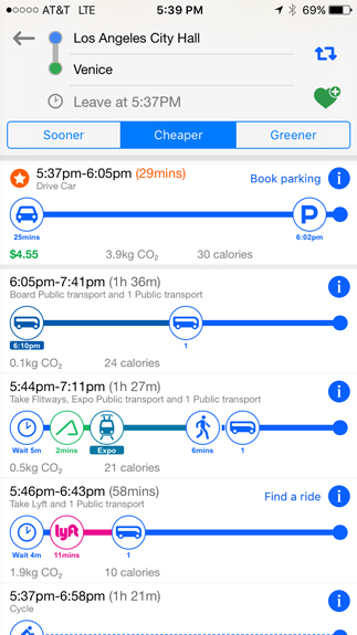As cool as that capability is, the Go LA app provides yet another innovative feature; namely, calculating trips from point A to point B and then categorizing the options by “sooner,” “cheaper,” and “greener.” Users are further empowered to make the best mobility choice to meet their needs and preferences through information related to price, trip duration, calories burned and carbon dioxide generated by their trip. Pretty slick.